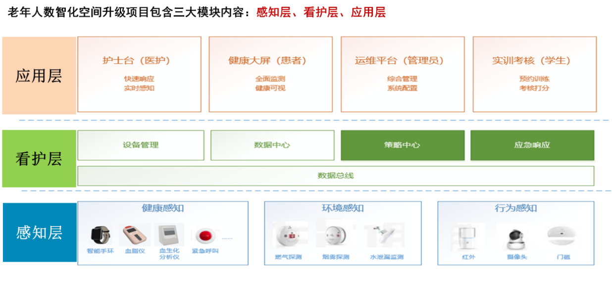 在应用层面上,通过护士台一体化终端设备,具备健康监测,呼叫,档案管理等功能。