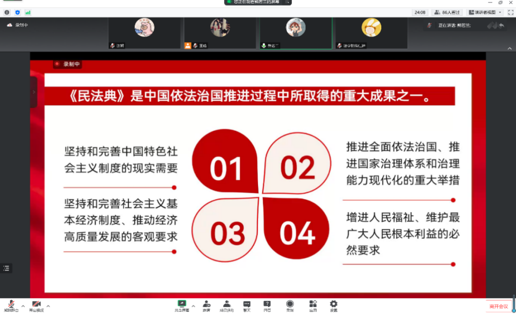 2022年是党的二十大召开之年,也是“八五”普法的关键之年。十年间,我国法律体系日益完备,其中最具代表性的是新中国第一部以法典命名的重要法律——《民法典》完成编纂并颁布实施。熊若兰老师首先带领我们学习了《民法典》与党的二十大的联系:《民法典》是依法治国推进进程中重大成果之一。除此之外,我们也体验了从时间这条历史长河上纵观了《民法典》的编纂过程。