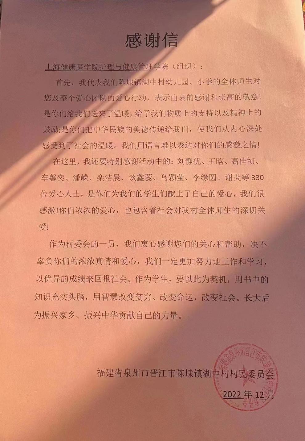 春风如约而至,为我们送来一整个春天的温暖,万物等待生发,爱心的种子也刚好发芽。春光明媚的日子里,护管与健康管理学院收到了来自福建省泉州市晋江市陈埭镇湖中村村民委员会的感谢信。纸短情长,让我们珍藏这封信的暖意,来一起回顾这场充满爱与希望的公益活动。