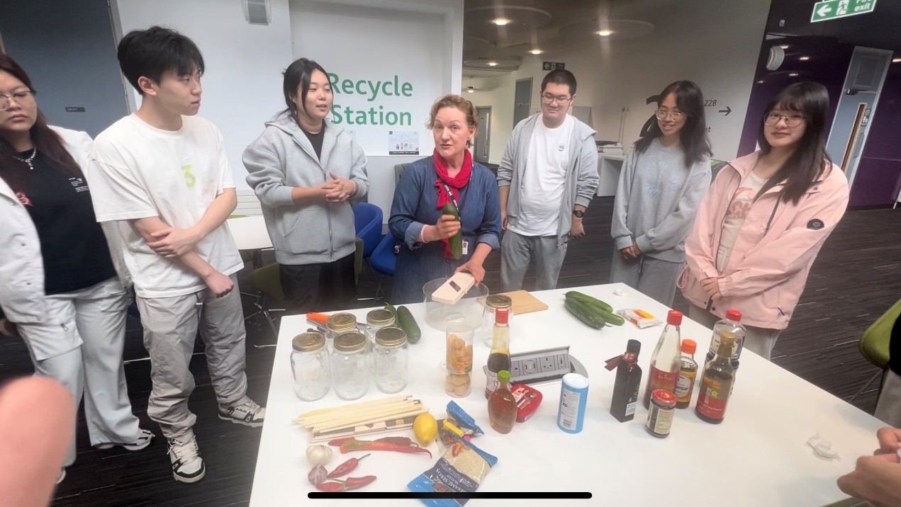 在巴斯斯帕大学课堂上,老师还巧妙地将时下流行的短视频平台TikTok与实际操作相结合,让同学们在课堂上观看了一段在TikTok上很火的凉拌黄瓜制作视频。不仅如此,老师还亲自从自家院子采摘了新鲜食材,带领同学们以小组为单位,亲自动手制作“英式”凉拌黄瓜,课堂气氛十分活跃。