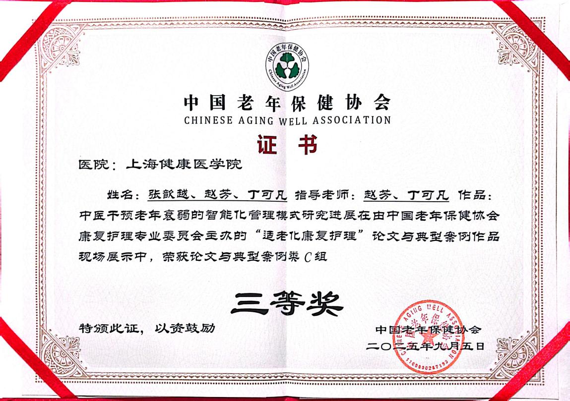 在适老化康复护理“论文与典型案例”作品展示活动中,由张歆越、赵芳、丁可凡组成的师生团队凭借作品《中医干预老年衰弱的智能化管理模式研究进展》荣获C组三等奖。23级健康服务与管理(本科)1班张歆越同学在分会场进行论文汇报,展现了学院在老年健康领域融合传统中医与现代智能技术的创新探索能力。