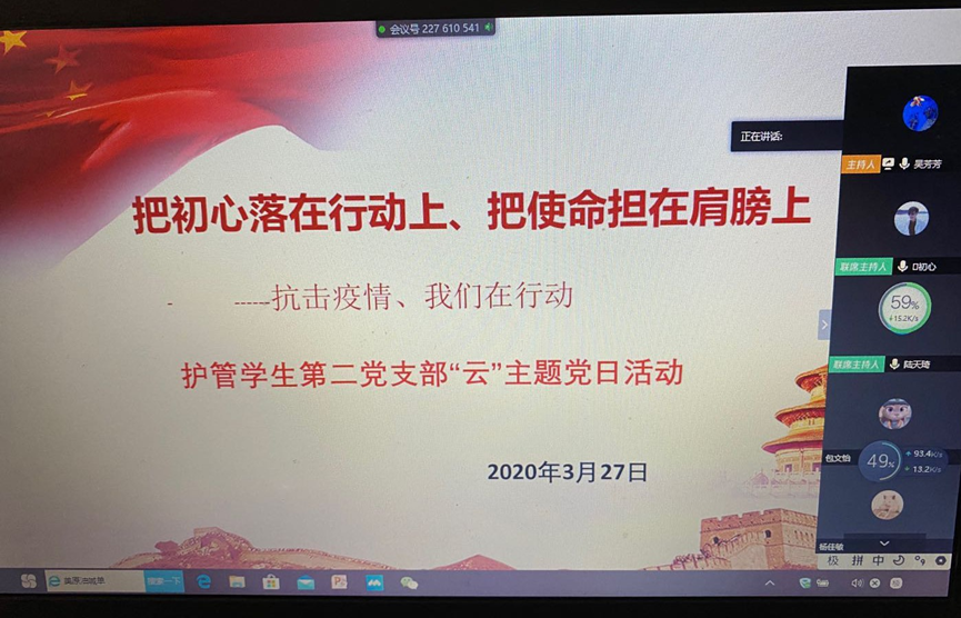 2020年3月27日下午15:00,诸侯快讯ok1122官网学生第二党支部通过“腾讯会议“开展了“把初心落在行动上、把使命担在肩膀上”--- “云”主题党日活动, 59名党员和积极分子同时在线,主题党日由吴芳芳老师主持。