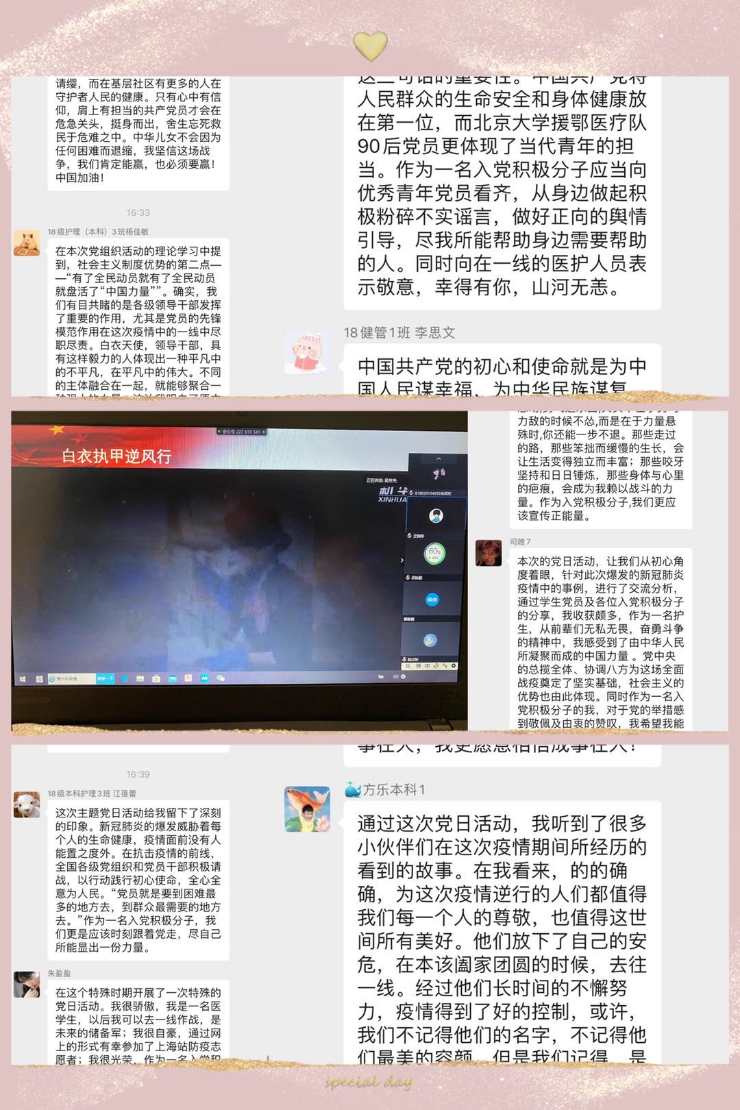 首先是理论学习,大家先集体观看了徐艳玲老师的以“制度优势”回答“初心使命”的教育视频,从党中央的集中统一领导和众志成城当中,更进一步了解到了社会主义的制度优势:其一,有了核心就有了“定海神针”;其二,有了全民动员就盘活了“中国力量”;其三,有了舆论引导就强了信心、聚了民心。随后中共预备党员嵇文颖同学朗读了《习近平给北京大学援鄂医疗队全体“90后“党员的回信”》激励广大青年应担当尽责、努力奋斗,让青春在党和人民最需要的地方绽放绚丽之花。