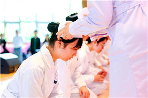 仪式开场,首先由护理前辈杨青敏老师点燃象征生命之光的蜡烛,彰显珍爱生命、奉献自己、服务他人的高尚情操。在严肃的传光仪式后,现场专家为近200位15级护生戴上洁白、圣洁的燕尾帽,将此次授帽仪式推向了高潮。随后,陆静老师带领护生在南丁格尔像前庄严宣誓,立志为护理事业奋斗终身。
