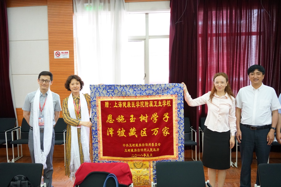 交流座谈后回访工作组一行在学校教工活动中心与全体玉树师生见面。为了表达诚挚的谢意,回访工作组向为玉树学生辛勤付出的学校领导及教师敬献了圣洁的哈达,并向学校赠送了“恩施玉树学子,泽被藏区万家”的锦旗,唐红梅代表学校回赠纪念品。