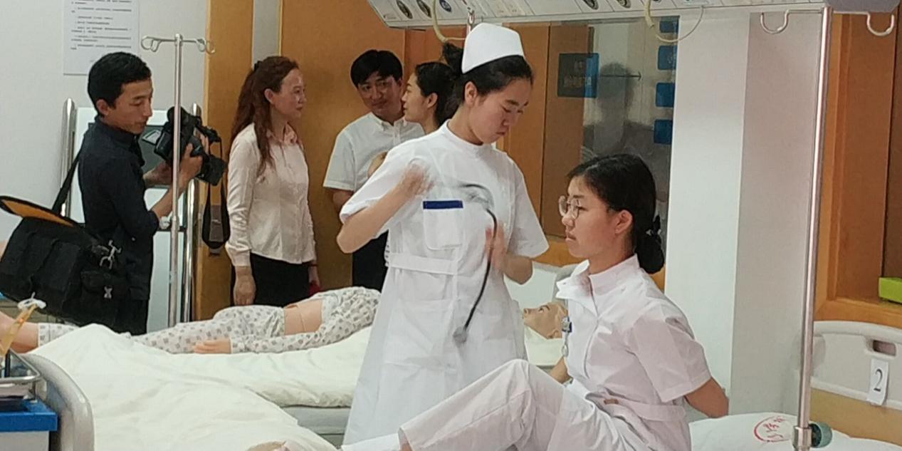 江海梅部长一行刚到学校,就深入学生的教学楼、护理实训中心、宿舍等学习、生活场所参观,实地了解学生的学习和生活情况,对学校的教学模式和完善的软硬件设施给予了高度评价。
