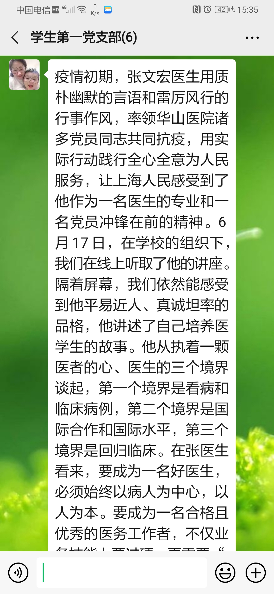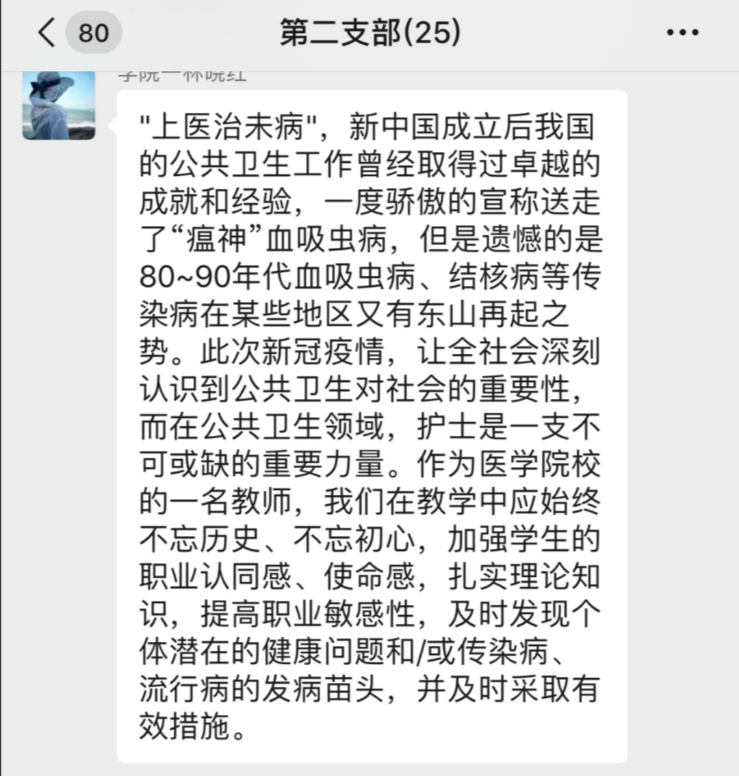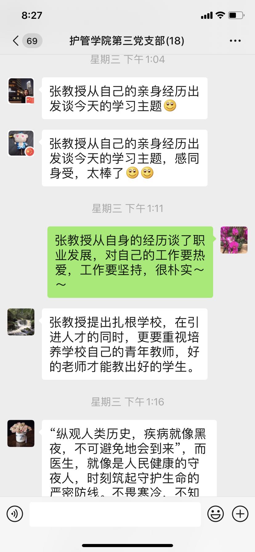 张文宏教授的这次专题报告会,是对全院教师“为人、为师、为学”的洗礼和启迪,也让大家深刻认识到基层公共卫生人才培养的重要性和责任,深刻认识到教育大计,教师为本的重要性。今后,护管学院将秉承“厚德至善、健行康民”的校训,在校党委的带领下,不断加强政治理论学习,加强青年教师培养,加强三全育人体系建设,为培养优秀的人民健康守卫者奋力前进。