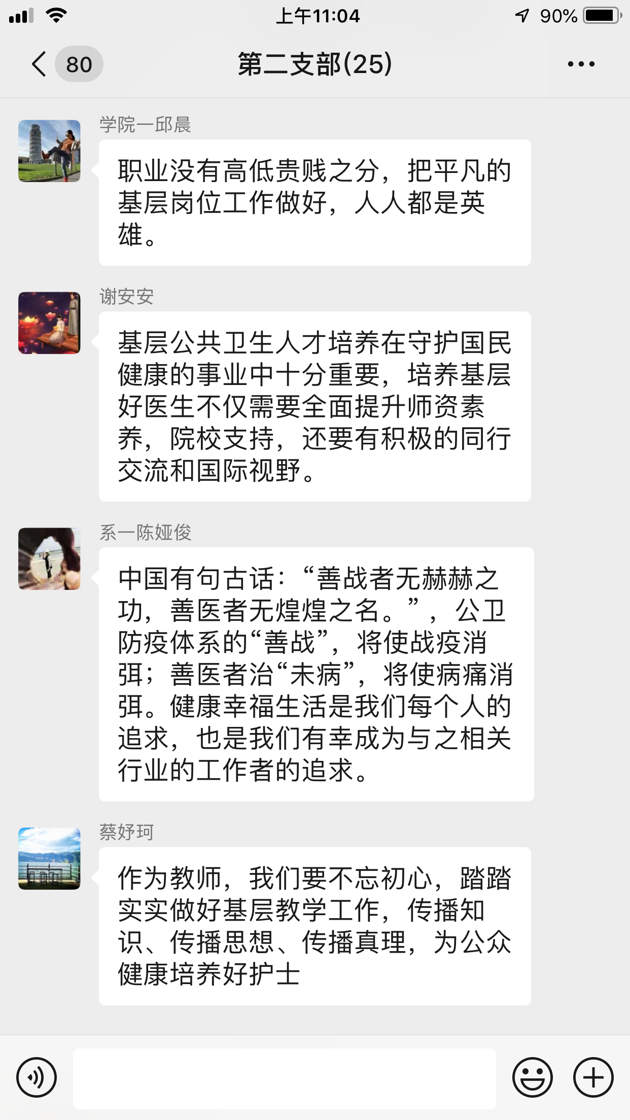 会后,护管学院老师们在各政治小组组长的带领下,围绕如何培养人民健康守护者进行交流讨论。 王欣国老师认为,“人无德无以立世”,教师应该身正为范,德高为师。培养学生必须始终坚持立德树人,要注重思政教育与专业技能的结合,将德润物细无声地融入教学之中。姚晓岚老师认为“为人”就要正直,“为师”耐心育人,关爱学生;“为学”就是要永无止境的学习,对专业精益求精,这也是她一直要努力的方向。张慧文老师表示,作为一名教师,一定要起到榜样作用,对教学的认真态度会感染到学生,让学生知道人生在勤不劳何获。临床就是一本没有终点的故事大全,有正面的故事有反面的故事,我们都可以在恰当的时机给同学们讲故事,既能够传授知识又能够传授道理。邱晨老师听完报告后感觉受益匪浅,她谈到医学生培养是全校每个部门的事情,不仅教育育人,也应该管理育人、服务育人,我们要在学校的带领下,共同做好三全育人的工作。胡捷波老师表示在这场突如其来的疫情中,中国把人民生命安全和身体健康放在第一位,共产党员发挥先锋模范作用,让她倍受鼓舞和感动,今后要在工作中深刻领会为人为师为学的内涵,为培养优秀的护士做出应有的贡献。陈颖老师表示作为辅导员尤其要注重学生思想的引导,在工作中不断提升党性修养,淬炼思想品格,加强思政育人的能力,为做好学生成长引路人不断努力。