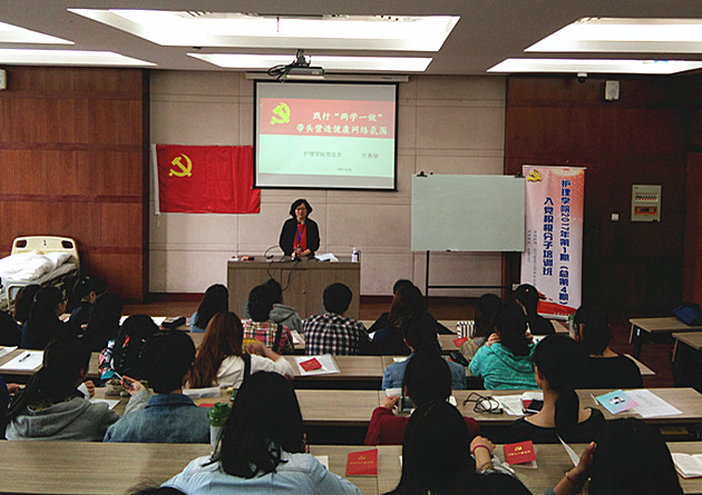 4月20日下午,护理学院学生党支部书记方秀琴老师在北苑9号楼的104教室由为学院教师党员代表和入党积极分子培训班学员带来“践行两学一做,带头营造健康网络氛围”的主题讲座。