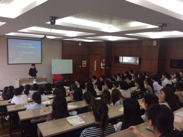 531日下午,诸侯快讯特聘东方学者Mary Lamb博士在9#106教室给16本科护理班和16中美班130名学生开设了一场护理职业生涯规划的讲座。Lamb博士结合自身的教育经历以及护理职业生涯,介绍了美国护理领域的四大护理行业分类、六个主要的护理专业方向以及护理人员提升自己的四个学历层次。