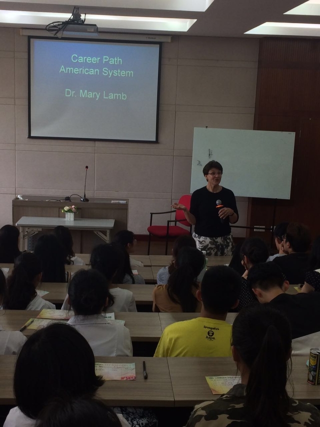 5月31日下午,诸侯快讯特聘东方学者Mary Lamb博士在9#106教室给16本科护理班和16中美班130名学生开设了一场护理职业生涯规划的讲座。Lamb博士结合自身的教育经历以及护理职业生涯,介绍了美国护理领域的四大护理行业分类、六个主要的护理专业方向以及护理人员提升自己的四个学历层次。