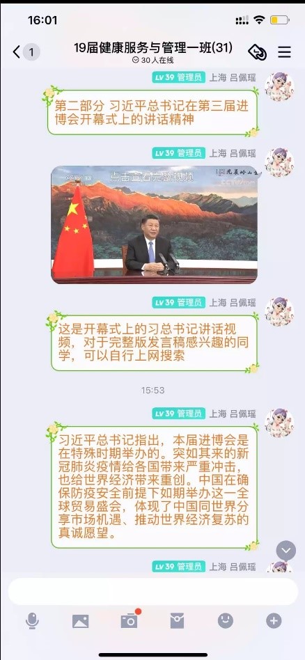 2020年11月19日在北苑2号楼605,19级护理(本科)1班全体成员开展第二次团日活动,由团支书介绍了党的十九届五中全会精神、总书记在第三届进博会开幕式上的讲话精神及总书记在浦东开发开放30周年大会上的讲话精神。