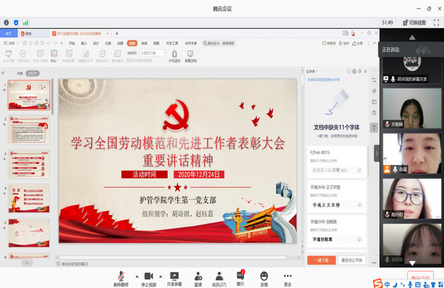 2020年12月24日晚18:30,护管学院学生第一党支部党员采用腾讯会议方式,围绕学习全国劳动模范和先进工作者表彰大会上习近平总书记讲话精神开展主题党日活动,会议由支部书记陈颖主持。