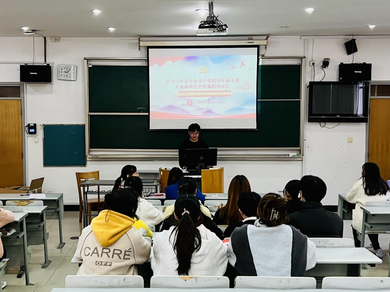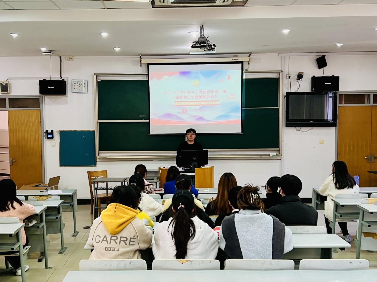 党日活动围绕党的第十九届第六次全体会议中审议通过的《中共中央关于党的百年奋斗重大成就和历史经验的决议》说明来开展,由谢远航和王燕雯两位学生党员进行领学,部分实习的学生党员通过PPT进行线上学习。