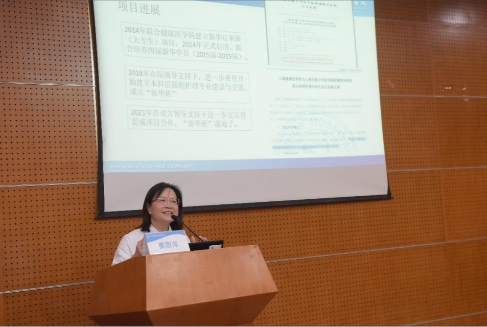 开班仪式由姜丽萍主持,姜主任首先回顾了自2018年以来本项目的推进过程,并分别从合作理念、合作模式、教育模式、教学模式、管理模式五个方面介绍了联合培养模式和合作方式,旨在通过创新的教学与管理,进一步激发学生的专业兴趣、增强专业感知、夯实专业知识、促进实践技能、提升沟通能力,让进入“新华班”联合培养的每一位学生在亦师亦友的大家庭中,尽早更好地实现角色认同、职业认同和专业认同,最终为护理学科发展做出贡献。