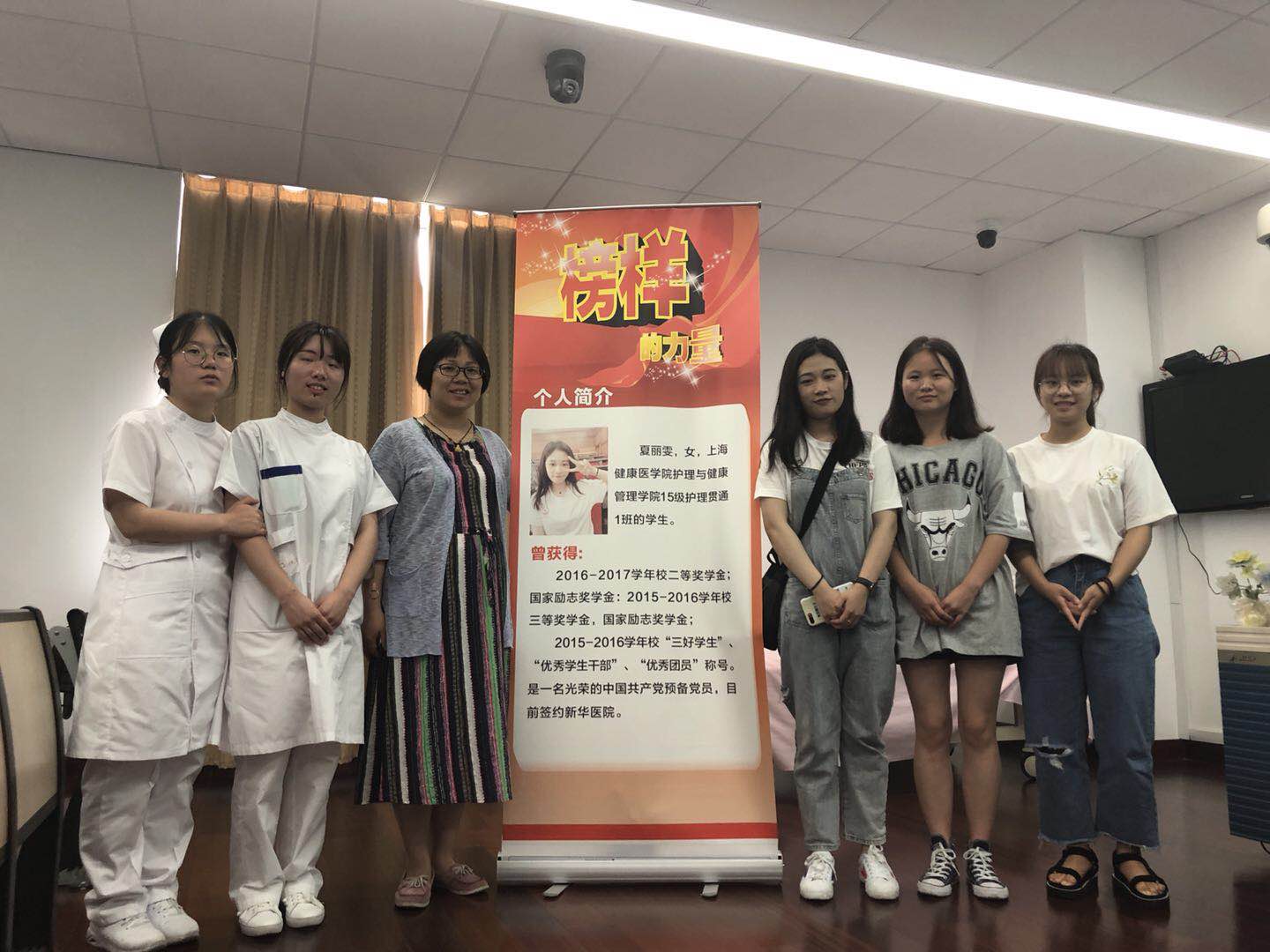 座谈开始,学姐夏丽雯简要的介绍了自己,预备党员,曾获2016-2017年学校二等奖学金,国家励志奖学金;2015-2016年学校三等奖学金,国家励志奖学金;2015-2016年学校“三好学生”,“优秀学生干部”,“优秀团员”称号。目前签约新华医院。