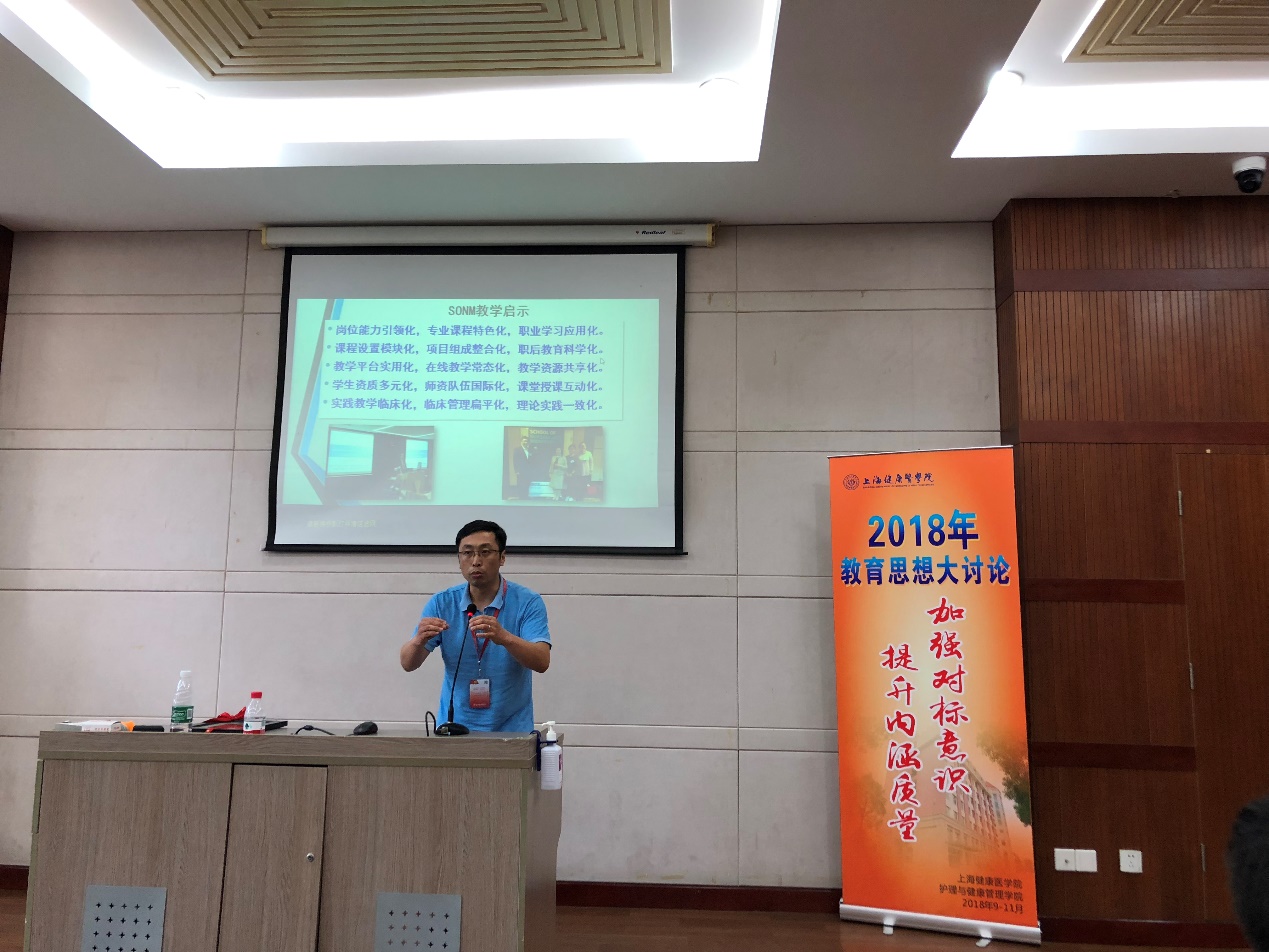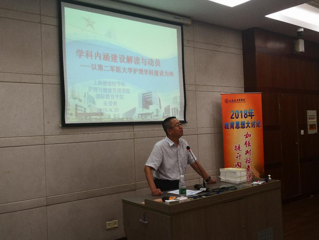 朱爱勇院长对诸侯快讯的学科内涵建设进行了深入地解读与动员。朱院长从内涵与背景;探索与实践;思考与建议来进行阐述。阐明护理的发展历程和学科建设与专业建设的辩证关系,最后凝练总结28字方针:提高认识、总结谋划、凝练方向、汇聚队伍、传承创新、构筑基地、加强交流。在内涵建设上树标立志的剖析和解读,带给教师们非常大的触动和启示,会上掌声阵阵。